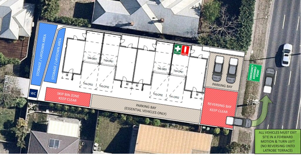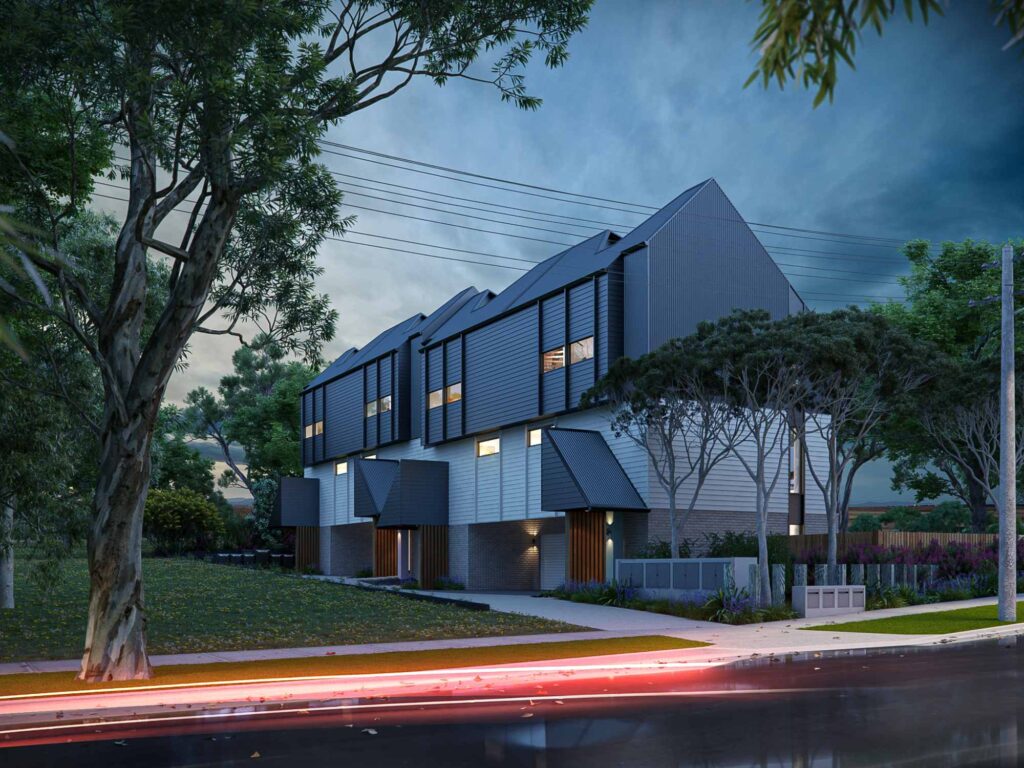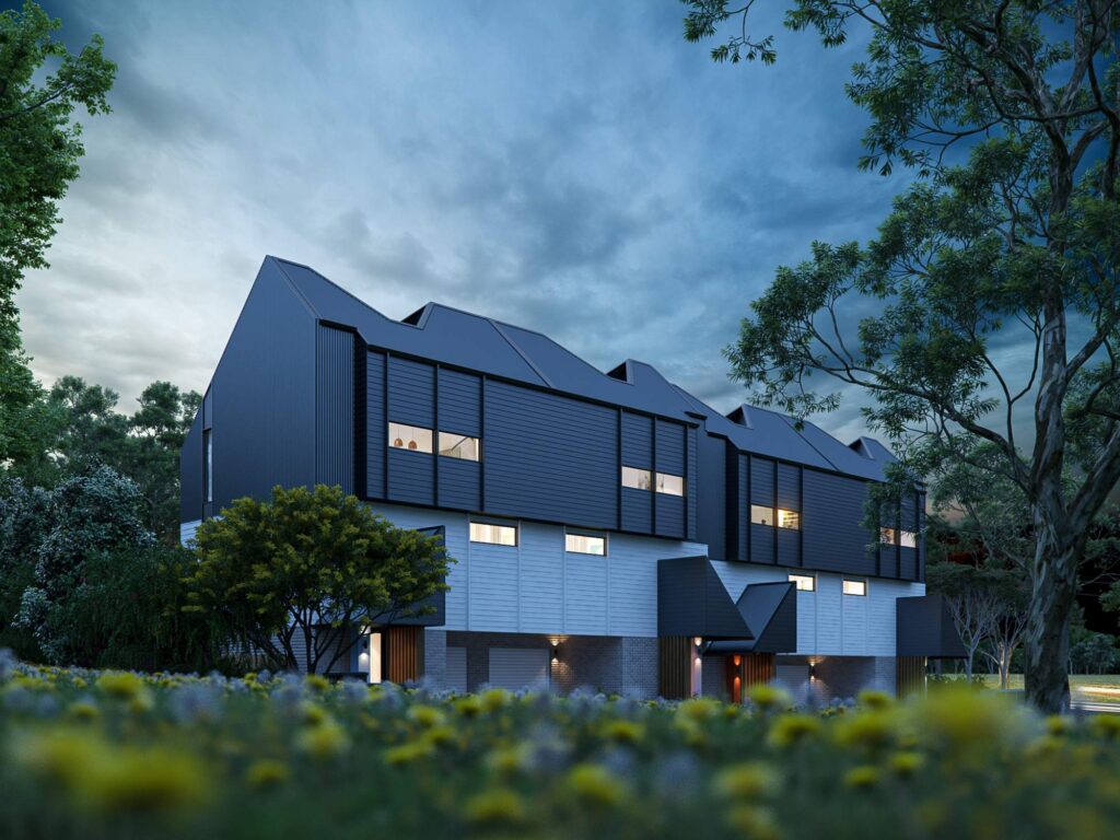 The ground floor of each townhouse features an outdoor car space plus a single garage with ample storage space, laundry, powder room, storeroom and a bedroom with access to a private rear courtyard. terrace on the top floor.